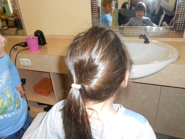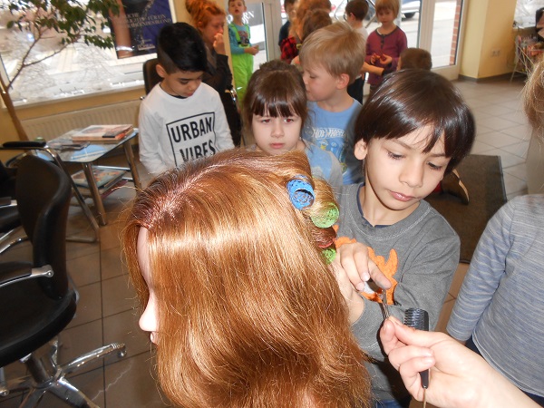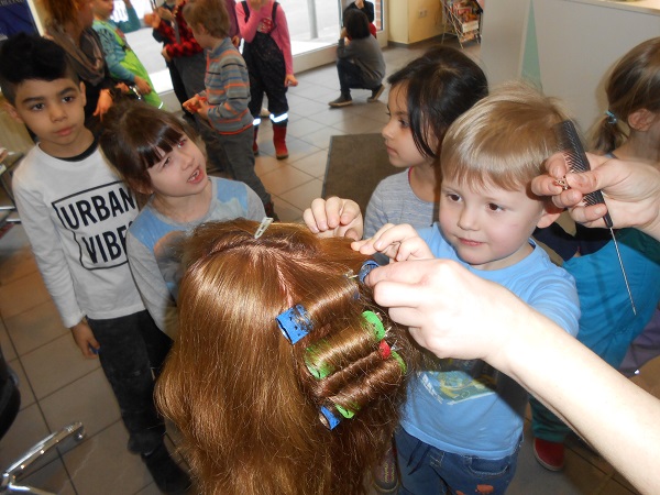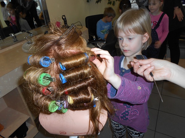 An einem Puppenkopf konnten alle Kinder das Aufdrehen einer Locke üben. Anschließend durften sich die Kinder noch auf einen Frisierstuhl setzen, wobei die Friseurin einen großen runden Spiegel hinter den Kopf der Kinder hielt, sodass sie ihren Hinterkopf im vorderen Spiegel sehen konnten.