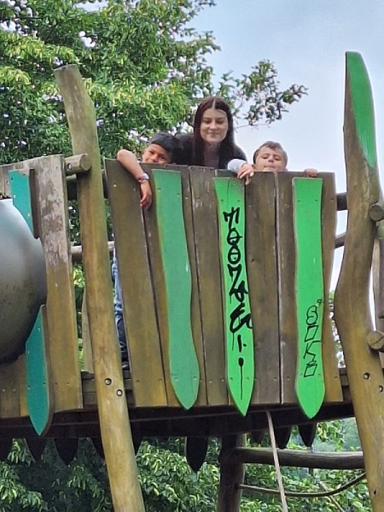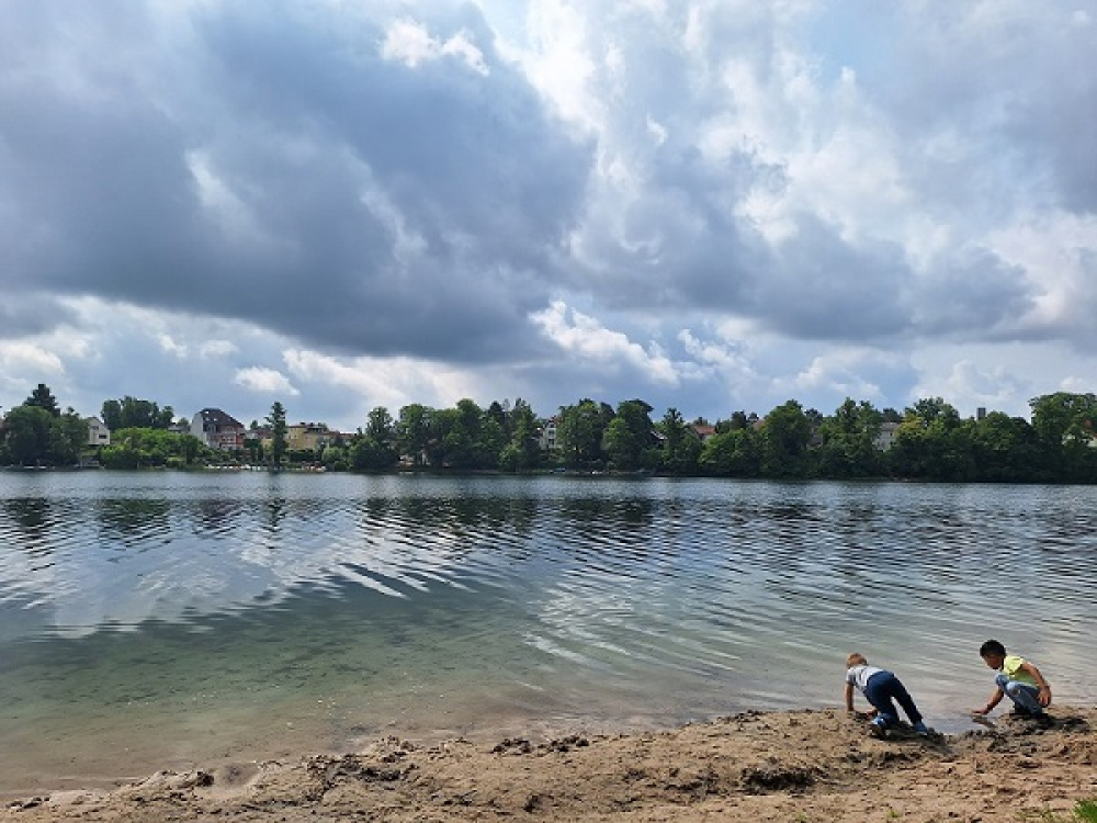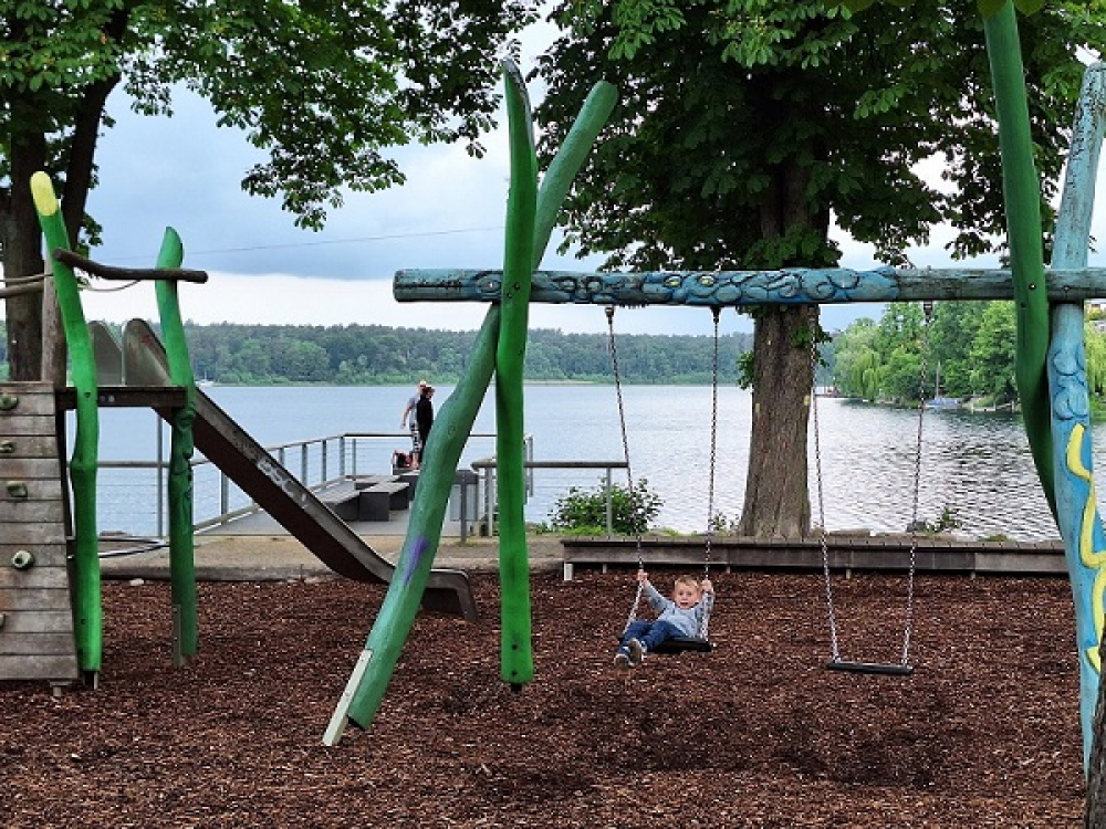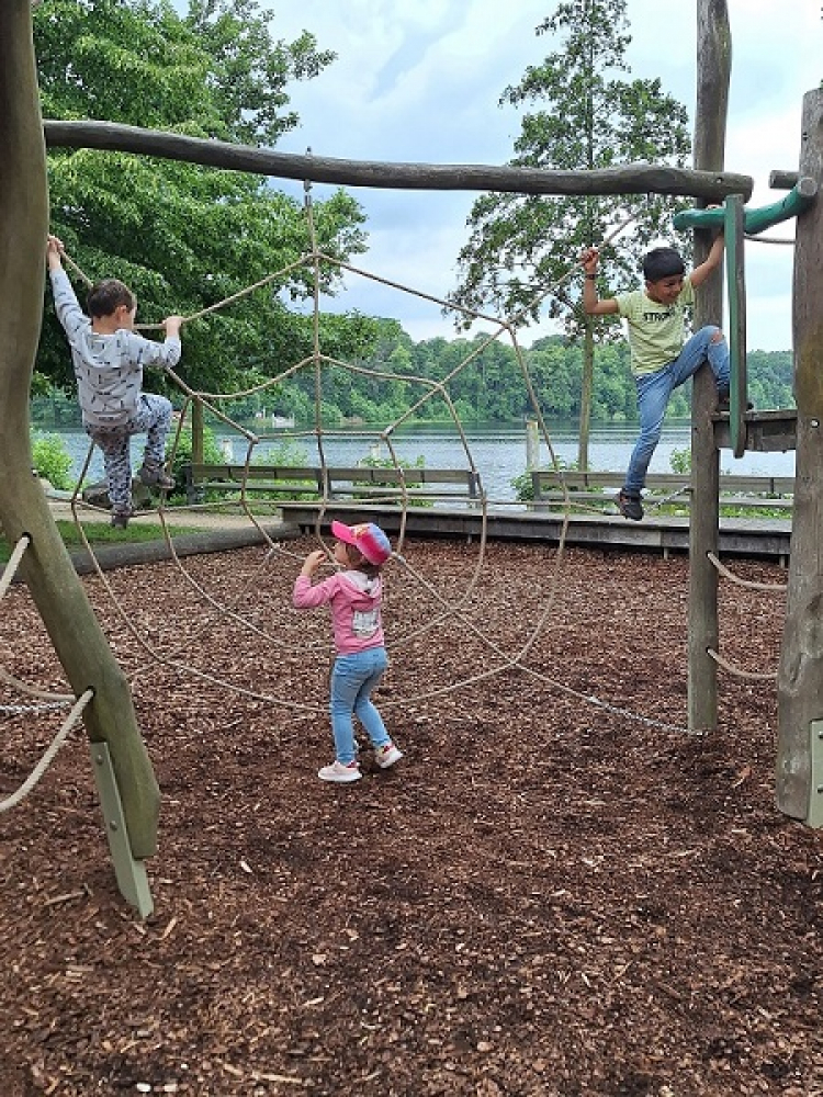 Dort angekommen wartet die Fähre, mit der sie über den See fahren. Jenseits des Sees spielen die Kinder am Wasser. Dann geht es wieder zurück und die Spatzen können sich auf dem Spielplatz austoben.