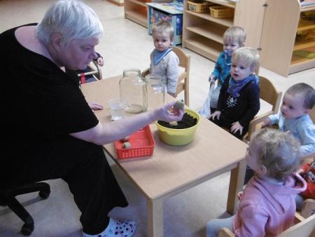 Zu Beginn haben sich die Kinder angeschaut, was alles dazu benötigt wird. Ein großes Glas, Erde, etwas Wasser und natürlich die Kartoffeln. Aufmerksam wurde alles bestaunt.