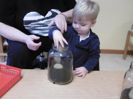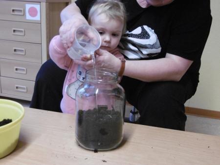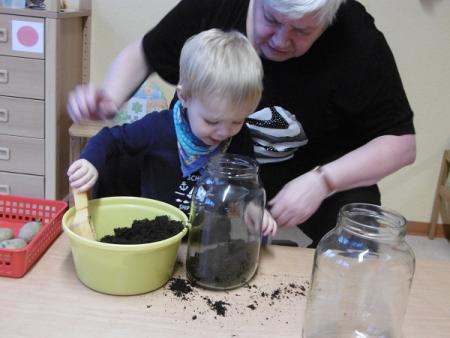 Dann haben die Kinder Erde in die Gläser gefüllt. Mit großer Begeisterung und viel Fingerspitzengefühl füllten sie die Gläser.