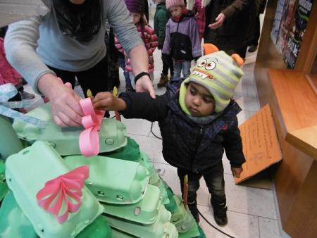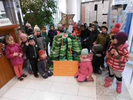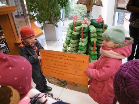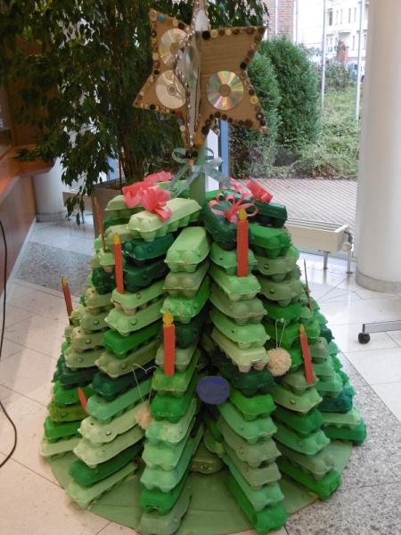 Einen ganz besonderen Weihnachtsbaum übergaben die Kinder und Erzieher der Mäuse- und Spatzengruppe in diesem Jahr der Stadtverwaltung. Im Zuge unseres Projekts "Spielzeugfreie Zeit" ist die Idee entstanden und wurde mit viel Fleiß und Begeisterung umgesetzt. Das Ergebnis kann sich sehen lassen. In leuchtenden Grün erstrahlt der Weihnachtsbaum aus Eierkartons, mit Sternspitze und Kerzen.